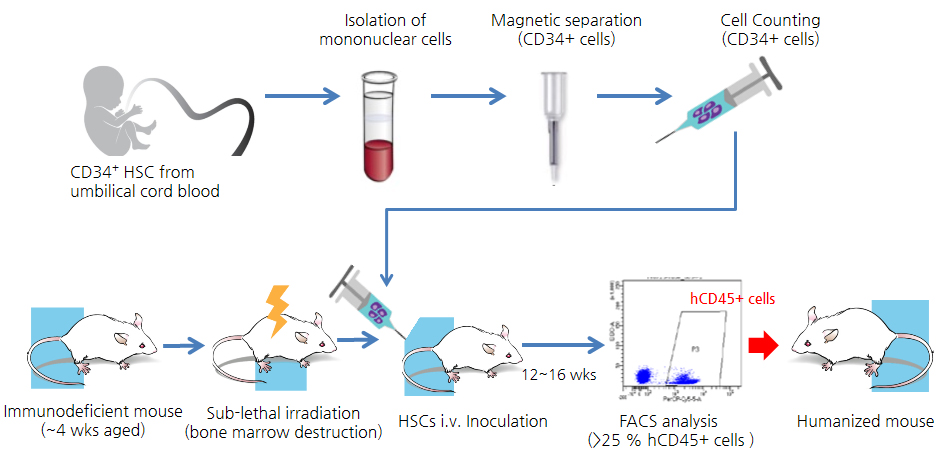 - Human immune systems are established by engrafting human CD34⁺ hematopoietic stem cells into immunodeficient mice