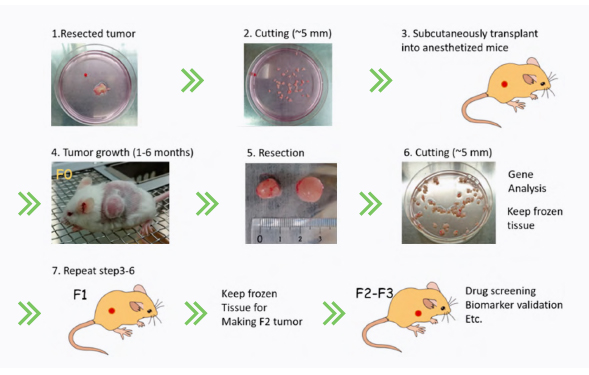 유전정보 확보된 환자 유래 암조직을 면역부전마우스에 이식하여 세포 독성 치료제 및 표적항암제 스크리닝에 활용.